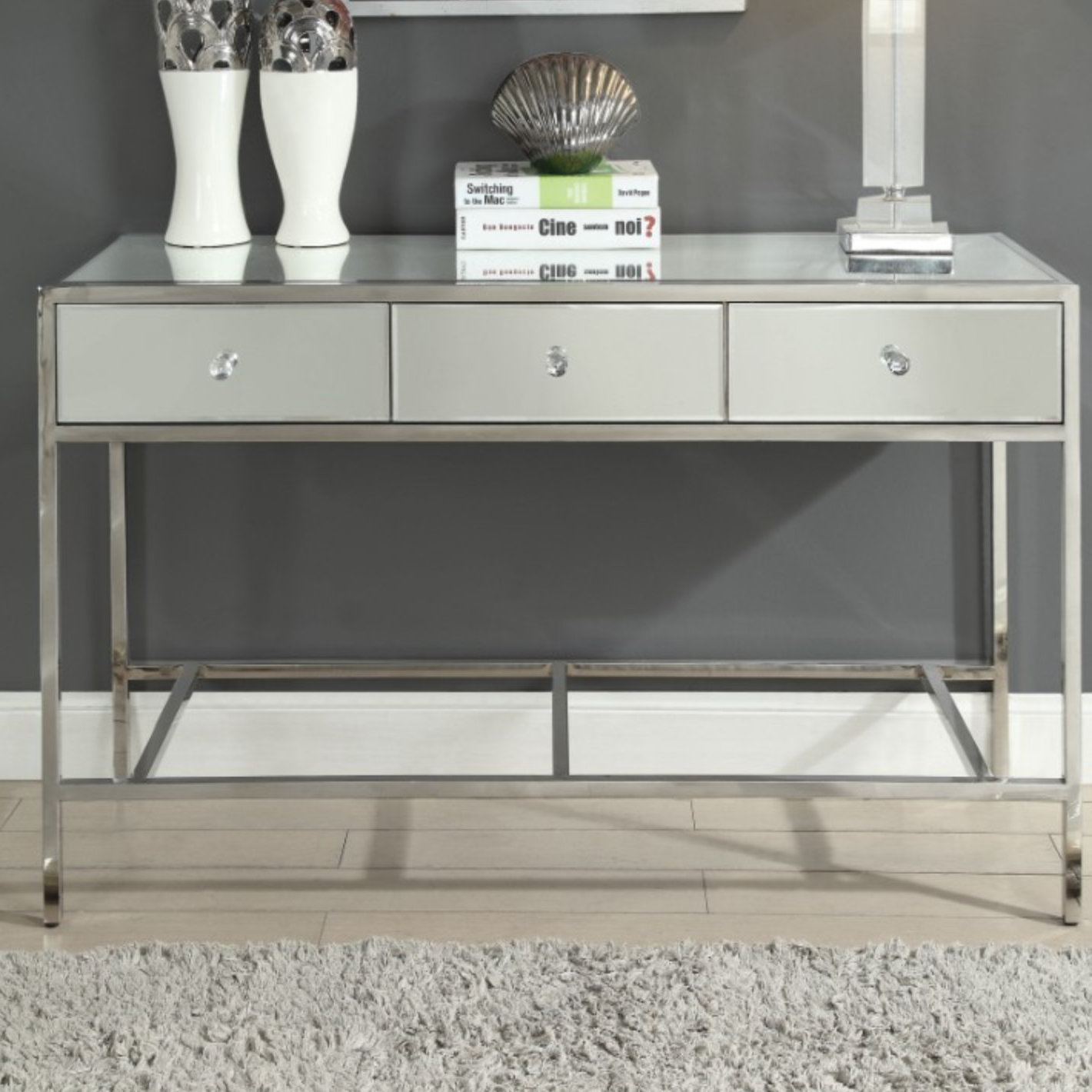 Elegant Silver Mirrored Console Table With Storage Drawers And