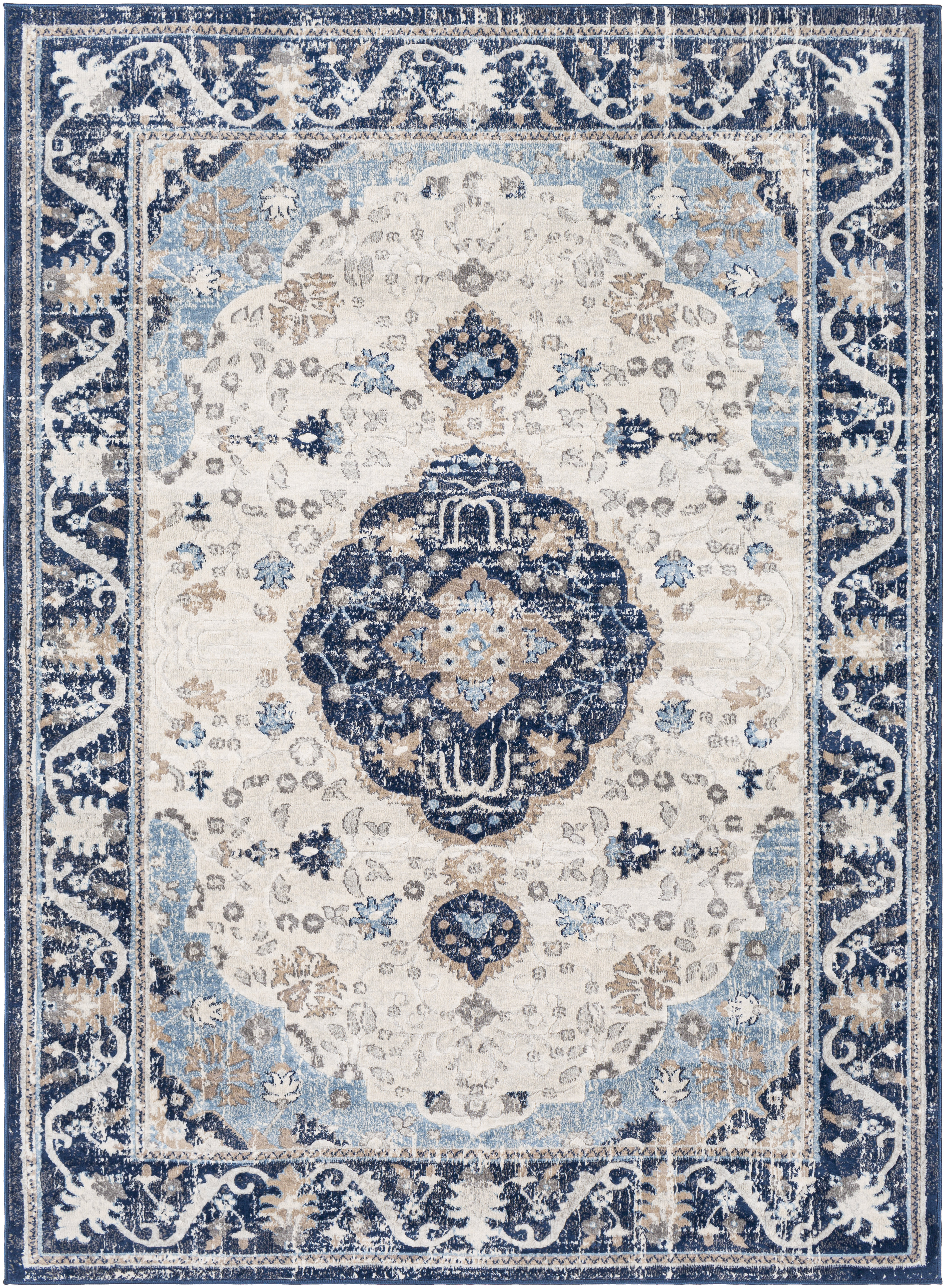 Traditional Medallion Distressed Navy Blue Cream Light Gray Area